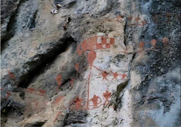 位于云南省臨滄市滄源佤族自治縣勐省、曼帕、丁來、吳良等10處海拔2000米以上的山崖上。約距今3000年。是用手指或羽毛等蘸抹紅色顏料繪成。顏料可能是用動物血調(diào)和赤鐵礦粉制作的。 崖畫主要是狩獵、采集等生產(chǎn)活動及娛神等宗教活動的場面。還有戰(zhàn)爭凱旋圖,上繪干欄式房屋建筑及手持兵器、驅(qū)趕豬羊勝利而歸的人們。所畫粗獷古樸,是研究南方古代民族歷史的重要資料。