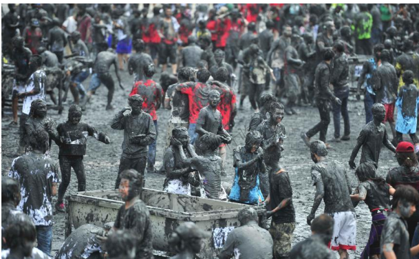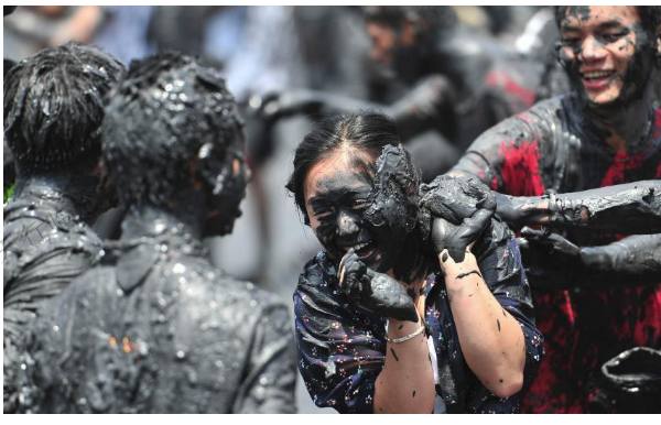 佤族就是這樣一個崇尚黑色的民族,"摸你黑",旨在讓參加狂歡的人們"黑"一回,真正和阿佤人民打成一片,當(dāng)一回阿佤人,體驗一次拋棄一切煩惱,超越塵世、穿越時空、回歸自然地人生經(jīng)歷。每到這個時候,人們就自愿地到指定的地點,用仿制的、具有防曬、美容護(hù)膚之功效的黑色泥狀保健品相互涂抹。這種類似于泥巴的糊狀物在佤族傳說中具有起死回生的神奇功效。
