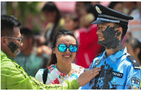 在"摸你黑"活動中,誰最黑誰就是最美,摸黑滿臉,代表開心永久、快樂永久;摸得越多,意味著幸福就越多。憧憬未來、向往美好、追求幸福、祈求平安和吉祥,是阿佤人積極向上的人生真諦。圖為游客向執(zhí)勤警察送祝福。
