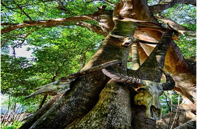 佤族的圖騰是牛,從進(jìn)入村寨開始,就可以在木樁上、神樹上、重要的建筑墻上,看到掛著的碩大牛頭骨。佤族的傳統(tǒng)建筑是干欄式的,下部用來飼養(yǎng)牲畜和堆放雜物,上面才是居住的茅草屋,屋頂上會(huì)開有天窗。每當(dāng)清晨和傍晚,整個(gè)村寨就會(huì)被裊裊炊煙所籠罩,非常原生態(tài)的自然生活場景。如果在村寨里住了一宿,深切體會(huì)了佤族村寨中的清晨和傍晚,美麗炊煙和那樹影婆娑的奇幻光影。
