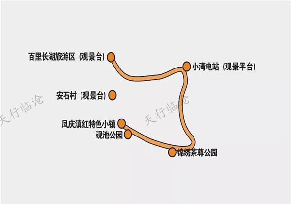 百里長(zhǎng)湖景區(qū)(觀景平臺(tái))—小灣電站(觀景平臺(tái))—錦秀茶尊公園—硯池公園—鳳慶縣城—接主游線