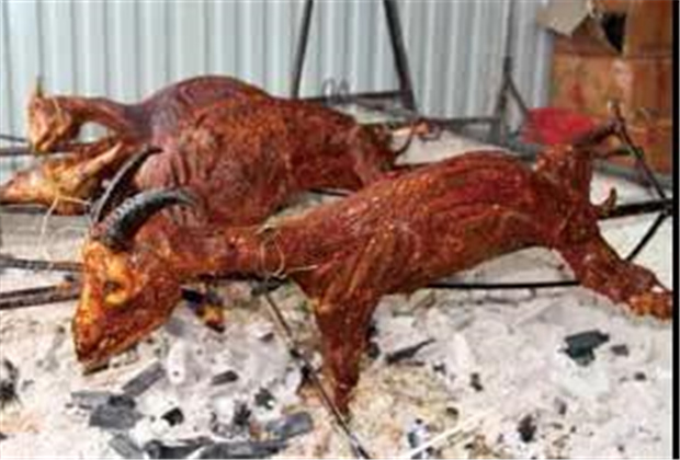 俐侎人烤全羊歷史悠久,之所以如此馳名,除了它選料考究外,就是它別具特色的做法:選擇羯羊或周歲以內(nèi)的肥羊羔作為主要原料,屠宰后割去羊頭,以細(xì)鐵條在羊腳毛皮下鉆洞吹氣,邊吹邊拍打,讓氣流貫滿全身,直到羊皮層膨脹,再澆沸水刮毛。刮洗干凈后,剖除其腸肚,再將羊尾用鐵簽別入腹內(nèi),胸部朝上,四肢用鐵鉤掛住皮面,羊腹內(nèi)放入調(diào)料,先用鹽、花椒、辣椒等佐料抹于羊體內(nèi)外,再以鋼釬縱貫羊體,置于炭火之上,翻轉(zhuǎn)烘烤。烘烤時還得不斷地抹上秘制的調(diào)料,約4~5小時后,羊皮黃肉熟,香味撲鼻,即大功告成??臼斓娜蛏珴晒饬?,皮脆嫩,味道極為鮮美,真可謂色、香、味俱全。宴席上俐侎頭人從羊頭、羊身、羊尾各品嘗一小塊后,其余人等方可動筷。吃時以刀分割成2~3指寬窄的小塊小條,置于盤中,佐以椒鹽等調(diào)料。