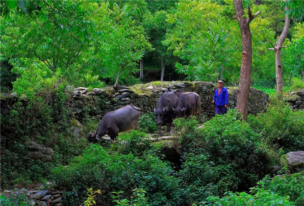 站在村外,古墨隱藏于郁郁蔥蔥的核桃林中。放眼望去,周圍的山都是一片青綠,青綠的山中星星點點的顯露出來的房子,告訴我們這里是一個有人居住的小村莊??吹窖矍暗木G影,旅途中的酷熱和疲憊全都煙消云散了。