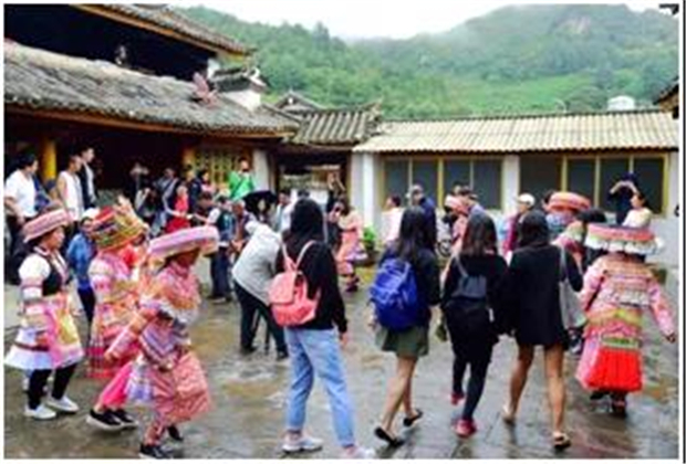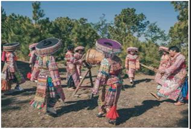 紫微村平坦組有著濃郁的民族文化氛圍,這里的苗族主要有“青苗”“白苗”和“花苗”三種,先祖從貴州遷徙而來(lái),由于大山與瀾滄江的阻隔,他們的許多習(xí)俗至今仍保存較為完整。穹湛藍(lán)、白云悠悠,綠茵婆娑的農(nóng)作物恰似五彩繽紛的袈裟,將峰巒疊萃的苗嶺山寨裝扮得婀娜多姿。清風(fēng)徐徐、炊煙裊裊,蜂來(lái)蝶往、人歡馬叫,樂(lè)于穿紅戴綠、花枝招展的苗家人的生活宛若這襲五彩繽紛的袈裟光彩奪目,別有風(fēng)味的苗家“三道茶”活像姹紫嫣紅、千姿百態(tài)的佳境 美辰耐人尋味,讓人流連忘返、樂(lè)不思蜀。這就是散居于新華鄉(xiāng)第二高峰牛肩山山麓的平坦自然村,村寨山巒起伏, 一片片核桃林披綠山坡,鳥語(yǔ)花香的情景到處可見,青瓦白墻的特色民居房和老房子散落山間,樸實(shí)的民風(fēng)和青山秀水一樣都令人驚訝。這里的苗族群眾會(huì)織布,善打歌,能釀沃沱籮酒。其中以對(duì)歌丟鈴結(jié)良緣的戀愛方式、月老踩親架鵲橋的提親方式和伴著歌聲渡銀河的迎娶方式最具特色。還有純手工制作的麻布苗族服飾,花枝招展、五彩繽紛、響鈴叮當(dāng)。在平坦村,體驗(yàn)最原始最豐富多彩的苗族文化?!昂夏_舞” 在眼前時(shí)隱時(shí)現(xiàn),“蘆笙曲”在耳旁悠揚(yáng)纏綿,“山歌調(diào)” 在心里迭宕起伏,盡情地在苗家小院品茗、賞俗,領(lǐng)略一方水土養(yǎng)育的獨(dú)具一格的風(fēng)土人情。