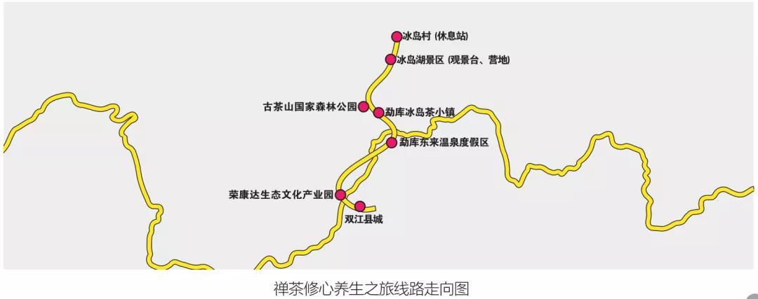 冰島村休息站—冰島村—冰島湖景區(qū)(觀景臺(tái))—冰島湖度假區(qū)露營地—古茶山國家森林公園(觀景臺(tái))—勐庫冰島茶小鎮(zhèn)—勐庫東來溫泉度假區(qū)—榮康達(dá)生態(tài)文化產(chǎn)業(yè)園—雙江縣城