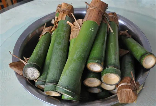 竹筒飯,清代陳鼎《滇游記》云:“騰越鐵少,土人以毛竹截?cái)?,?shí)米其中,熾火煨之,竹焦而飯熟,甚香美,稱為竹釜?!币灾駷楦娘L(fēng)俗,傣族及景頗族中至今都還存在。選一根嫩竹子,鋸成數(shù)截,一端開口,然后把紅米、臘肉、花生、草果等拌好放進(jìn)去,加水塞住開口,放到火上燒,等到竹子焦黃欲裂時(shí),里面的飯食也熟透了。竹筒飯,妙就妙在融進(jìn)了竹子特有的香味,吃起來(lái)滿口清香。