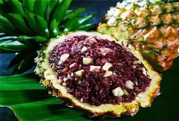 菠蘿紫米飯為耿馬傣族的特色糯制食品。制作時(shí),先將紫糯米淘洗干凈,浸泡七八個(gè)小時(shí),然后與剁細(xì)的豬肉拌勻,用刀在菠蘿頂端開個(gè)蓋,掏去菠蘿心,放入紫糯米,再把切去的蓋蓋上,放到甑鍋里蒸熟。其味香甜可口,且有補(bǔ)血潤(rùn)肺之功效。