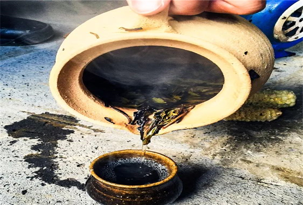 佤族“煮苦茶”是佤族民間常用的飲用茶。該茶具有清涼解渴的作用,其湯色濃郁,尤如煨出來的中藥湯,喝時雖然味苦,但喝后覺得清涼。它對氣候炎熱,遠離寨子在田里勞動的佤族人民具有神奇的解渴作用。它是佤家最常用的禮儀茶道。