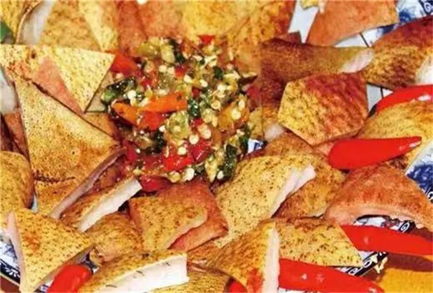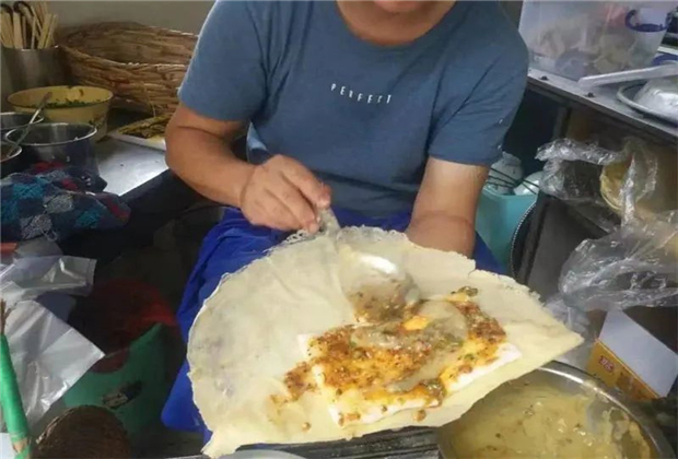 粑粑卷的主要配料有大米粑粑、鍋巴、稀豆粉和各種調(diào)料,鍋巴和稀豆粉是“靈魂”,并且都是由豌豆粉做成。將豌豆粉加水稀釋,隨后加鹽、辣椒面等進(jìn)行調(diào)味,用勺子在燒熱的鐵鍋中均勻涂抹調(diào)好的豌豆粉,幾十秒內(nèi),一張香脆可口的粑粑卷外皮就做好了。此時,將大米粑粑烤熟,加入蒜末油等調(diào)味料,一卷美味的粑粑卷就做好了。輕咬一口,口感軟糯脆香脆,味道可口,是不可錯過的鳳慶美食。