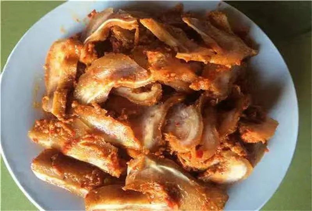 骨頭參是一年四季都可食用的具有民族風(fēng)味的咸菜,也是永德百姓喜愛的傳統(tǒng)美食之一。用剁刀把新鮮的豬排骨、脊梁骨、五花肉等剁碎,加入草果粉、料酒、食鹽等調(diào)料充分?jǐn)嚢韬蠓湃胩展拗袎簩?shí)密封,置于陰涼干燥處放置半年即可食用。腌制好的骨頭參,可煮面條,亦可煲湯,美味還未入口時,只是看著就讓人垂涎三尺。