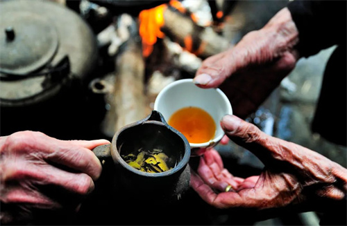 相傳,拉祜人在打獵時迷路,吃光所帶的水和食物后,為了保命,隨手在森林里抓了幾片葉子放進(jìn)嘴里嚼,意外發(fā)現(xiàn)這些葉子不僅清香可口,嚼完后還能使人起精神來。這種葉子就是茶葉。南美拉祜族鄉(xiāng)栽培古茶樹主要分布于坡腳村,約300畝,品種為勐庫大葉茶。野生的古茶樹群落則分布于坡腳村仙人山、鐵廠箐和南華山等原始森林中,是臨翔區(qū)野生茶樹的代表性群落。這里的野生茶樹種群密度高。最粗的1號大茶樹基圍230厘米、樹幅15米×13米、高20米。在走訪的過程中,我們發(fā)現(xiàn)南美有一片數(shù)千畝的老茶園,樹干的高度與樹干的根粗,均是300年以上的古樹才能達(dá)到。古茶園成片生長,茶園分布以家為單位。偶遇的一位茶農(nóng)說:“基本都是一家人有幾十棵大茶樹,這個是祖輩留下的。好多人都來看大茶樹?!薄?拉祜人)平時喜飲烤茶?!闭f起茶,茶農(nóng)非常熱情??静?,拉祜語叫“臘扎奪”,是一種古老的飲茶方法。用陶制小罐把茶葉烤香,然后注入滾燙的開水,茶在罐中沸騰翻滾,發(fā)出一陣陣唏唏聲響,這叫吃烤茶。如果有客人來了,必須烤茶招待,煮出來的第一罐茶是自己飲,第二罐才是客人飲用。煮出來的第一道茶水主人自喝了,表示茶中無毒,請客人放心。煮出的第二道,茶味正濃,味道最好,所以用第二道茶招待客人。除了烤茶,拉祜人也吃糟茶?!痹悴枰彩抢葑逡环N非常古樸而簡便的飲茶方式。將鮮嫩茶葉采下后,加些水在鍋中煮半熟后,將茶葉取出置于竹筒內(nèi)存放,飲用時,取出少許放在開水中煮片刻即飲用。這種茶水略有苦澀酸味,有解渴開胃的功效。
