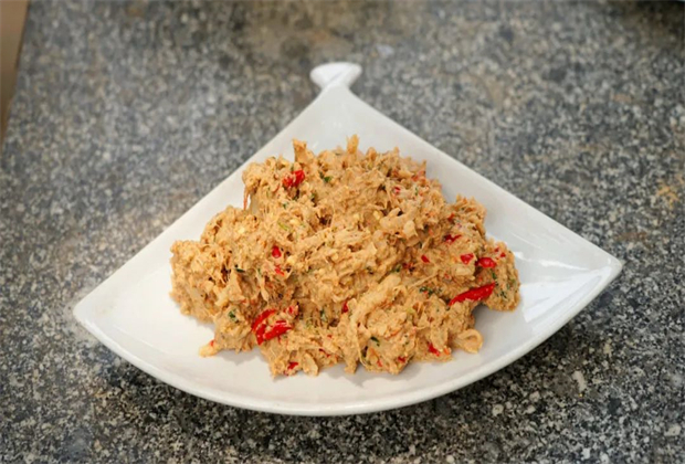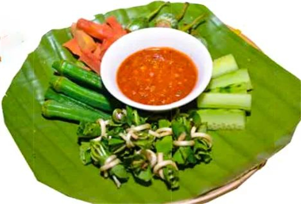 傣家菜的色彩是熱鬧的,一桌子赤橙黃綠青藍(lán)紫,像孔雀開屏,陣勢(shì)擁擠,大碟、小碟擠得再大的桌子也不夠用,每個(gè)菜都有自己的“喃泌”——各種蘸水,有番茄醬、芝麻醬、辣椒醬等。酸甜苦辣一齊涌現(xiàn),讓人大呼過(guò)癮。