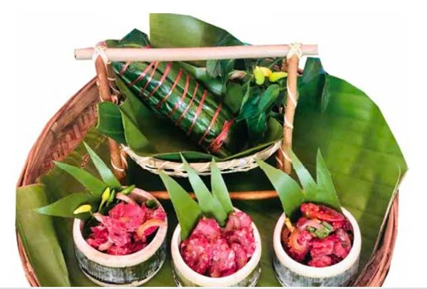 傣族人嗜酸辣,烹調(diào)喜涼拌及烘烤。用綠芭蕉葉和竹筒當(dāng)炊具,賞心悅目。