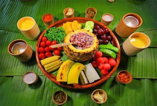 約會吧__佤王宴是滄源流傳了幾干年的傳統(tǒng)飲食習(xí)俗,由諸多豐盛的佤族特色美食構(gòu)成,被譽為臨滄的”滿漢全席“。過去是佤王用來招待部落首領(lǐng)民族英雄、異族使節(jié)及尊貴嘉賓的王府盛宴,故又稱“至尊佤王宴”。