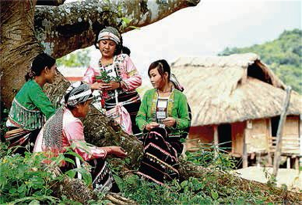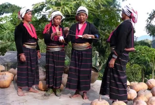 “藤篾腰箍”為飾,傳說古時候德昂女子是滿天飛的,男子為了將女子拴住,便用藤篾做圈,套在女子腰上,久之而成俗。這一裝束,歷經(jīng)宋、元、明、清千余年。德昂族的姑娘成年后,在裙子的腰部佩戴上五六圈或十余圈,甚至二三十圈藤蔑制的“腰箍”,這些“腰箍”寬窄粗細不一,多漆成紅、黑、黃、綠諸色,有的上面刻著各種花紋圖案,有的還包上銀或鋁皮,在陽光照射下閃閃發(fā)光。德昂族認為,姑娘身上佩戴的“腰箍”越多,做得越精致,越說明她聰明能干、心靈手巧。因此,成年婦女都佩帶腰箍,并以多為榮。青年男女在戀愛期間,小伙子為了博得姑娘的愛,也往往費盡心機,精心制作刻有動植物圖案花紋的藤篾腰箍,送給自己心愛的姑娘。于是腰箍又成了她們愛情的信物。