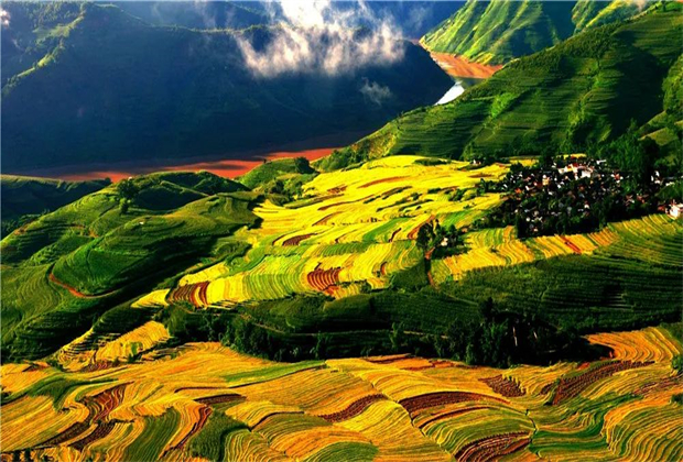后箐鄉(xiāng)的菠蘿村,那是位于江邊的田園風(fēng)光美妙絕倫,大山間的梯田是勞動人民智慧的結(jié)晶,一年四季景觀各異:春來水滿田疇,如串串銀鏈掛山間;夏至佳禾吐翠,似層層綠浪排蒼穹;金秋,稻穗沉甸,像座座金塔頂玉宇;隆冬,雪兆豐年,若環(huán)環(huán)白玉砌云端。