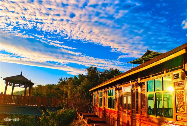 石洞寺旁,倚靠茶山,一磚一瓦,一樹一花均是民宿主人的心血,房舍隨著山勢鋪開,錯落有致,古剎銅鐘聲悠悠。