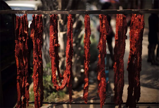 云縣回族群眾素有飼養(yǎng)菜牛腌制清真牛干巴的傳統(tǒng)手工藝。牛干巴味道鮮美可口,易保存攜帶,食用方便,因而頗受廣大消費者的青睞?;刈逡缰粕盐睹赖呐8砂停叵任桂B(yǎng)壯牛。宰牛,按照傳統(tǒng)習(xí)慣都由阿訇下刀,將割下的肉鋪在通風(fēng)處涼透,之后再進(jìn)行腌制,至肉面干硬,呈板栗色。煎干巴片香醇酥脆,油而不膩,實為酒席上的佳肴。