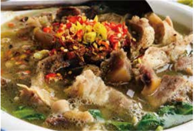 牛扒烀,其實就是類似清湯牛肉,牛扒烀里有牛肉、牛蹄筋、牛骨、牛雜、腸肚等,用小火慢慢把牛肉烀到軟爛。牛扒烀色白醇香,味道非常贊!吃時一定還得有薄荷、煳辣椒蘸水。牛扒烀為臨滄最常見的牛肉吃法。