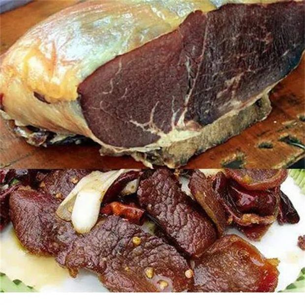 宰牛,按照傳統(tǒng)習慣,得由阿訇下刀,經(jīng)放血、剝皮、開膛,分前、后兩半截上掛,然后順著肉縫,剖成24塊凈肉,并將割下的肉鋪在通風處涼透。之后再進行腌制——先將鹽撒在肉上搓揉,再放入陶制的大甕缸內(nèi)腌,缸口須用硬紙或麻布蓋緊扎好,腌20~30天便可以出缸晾曬,直至肉面干硬,呈板栗色。每條牛宰后可腌24塊——即12對牛干巴,每對都有名稱。其中,“飯盒”“里襠”為上品,肉質(zhì)細嫩,容易切片,食用時,煎煮均可,尤以香油煎吃為妙。煎干巴片,味香醇酥脆,油而不膩,實為酒席上的佳肴。