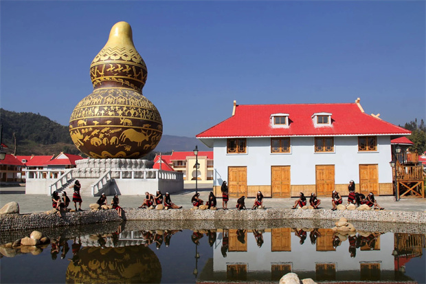 滄源葫蘆小鎮(zhèn)內(nèi)紅色弧形屋頂特色民居與文化墻、噴水葫蘆、打歌廣場(chǎng)、寨心磚、葫蘆塔、佤王府等佤族特色建筑巧妙